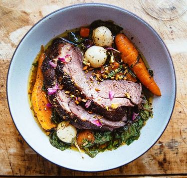 Braised Lamb Shoulder with Rose, Turnips, and Pistachio