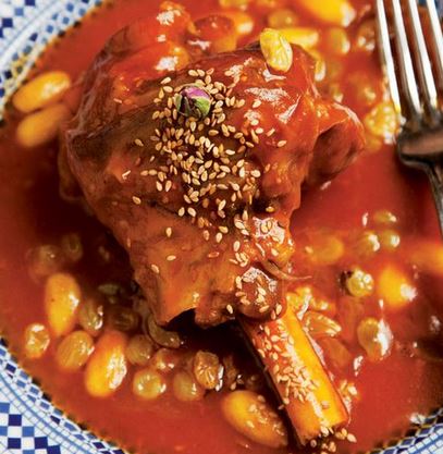 Sumptuous sauce of honey, almonds, and raisins in this centuries-old Moroccan dish.